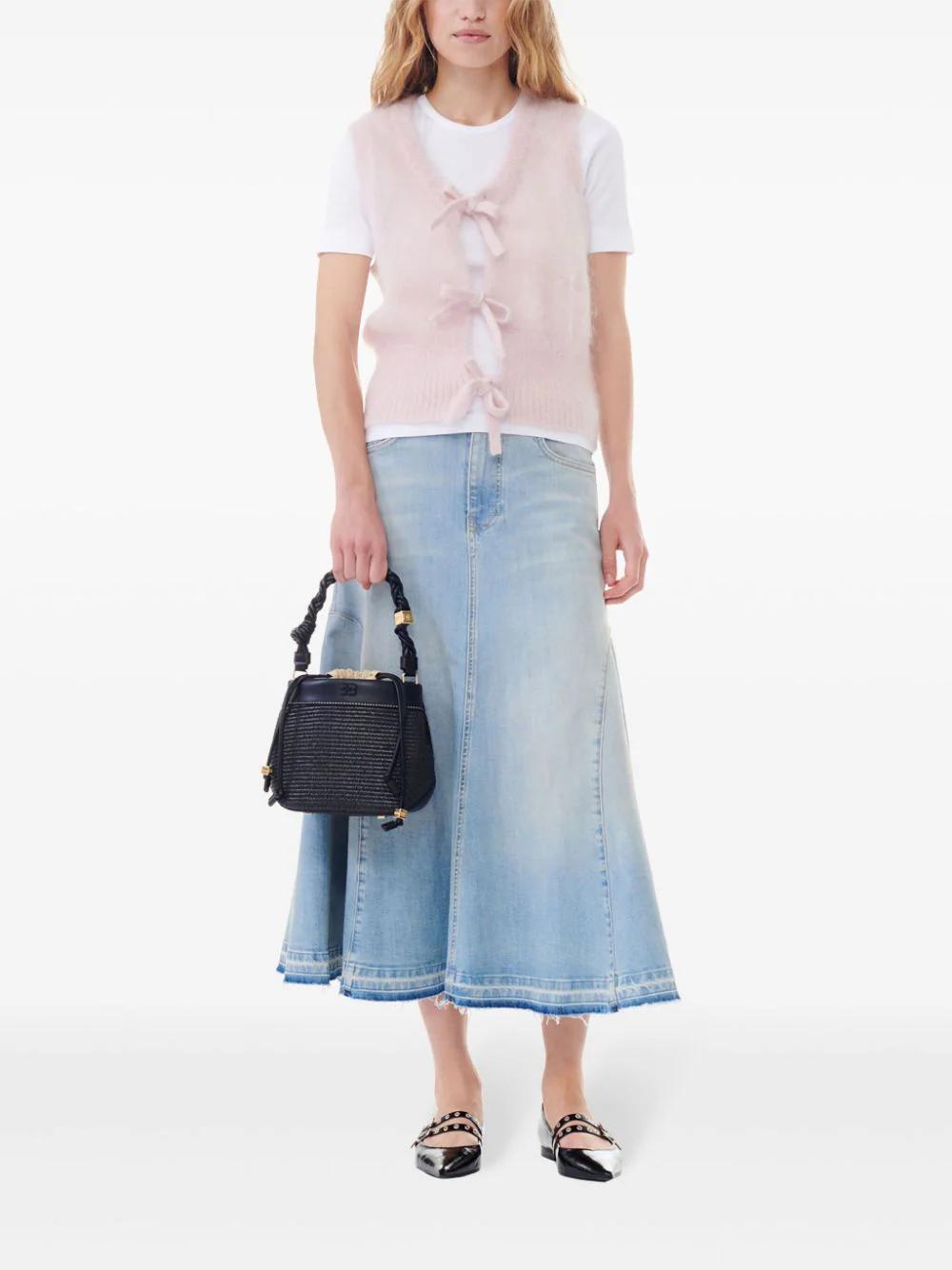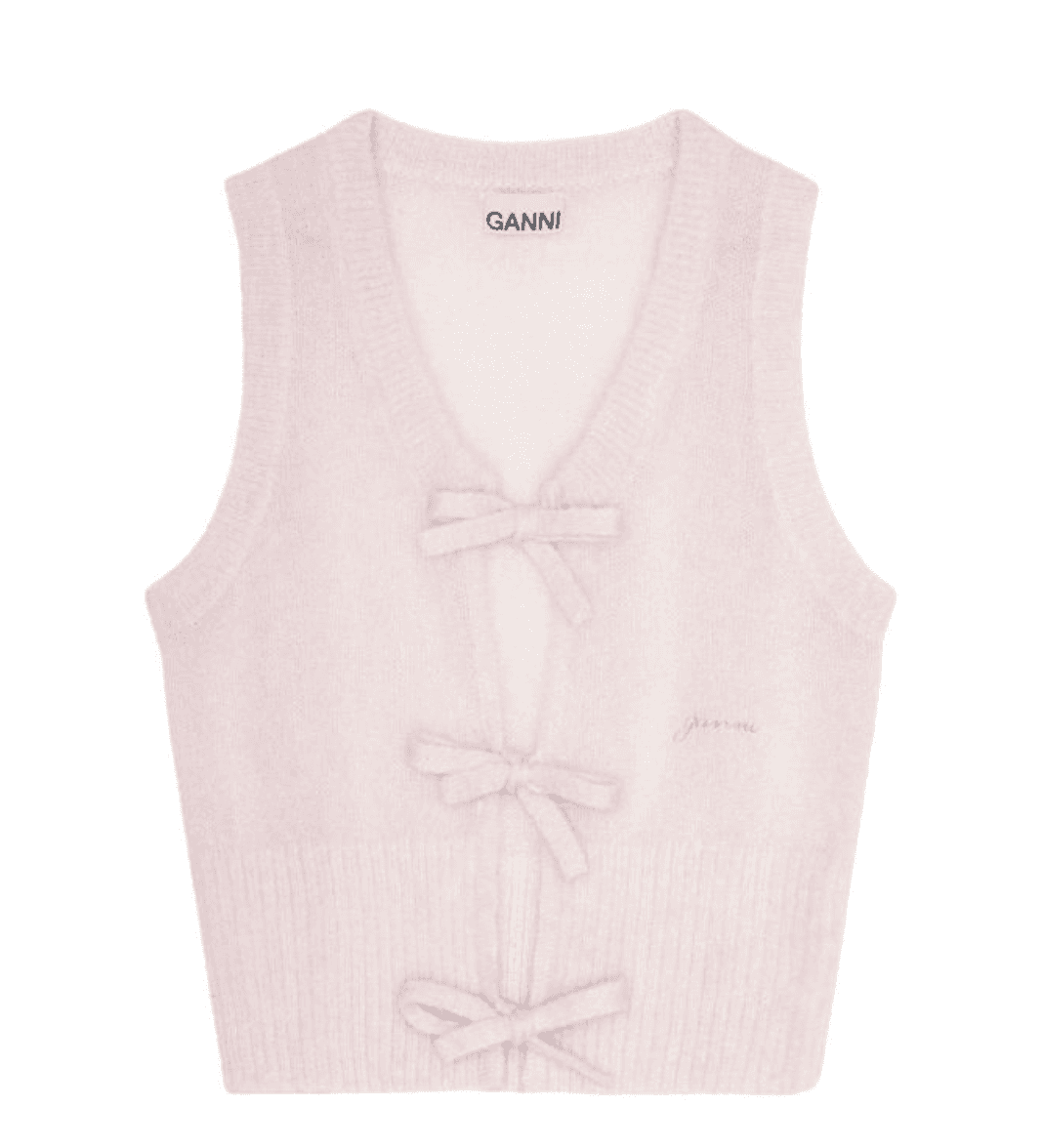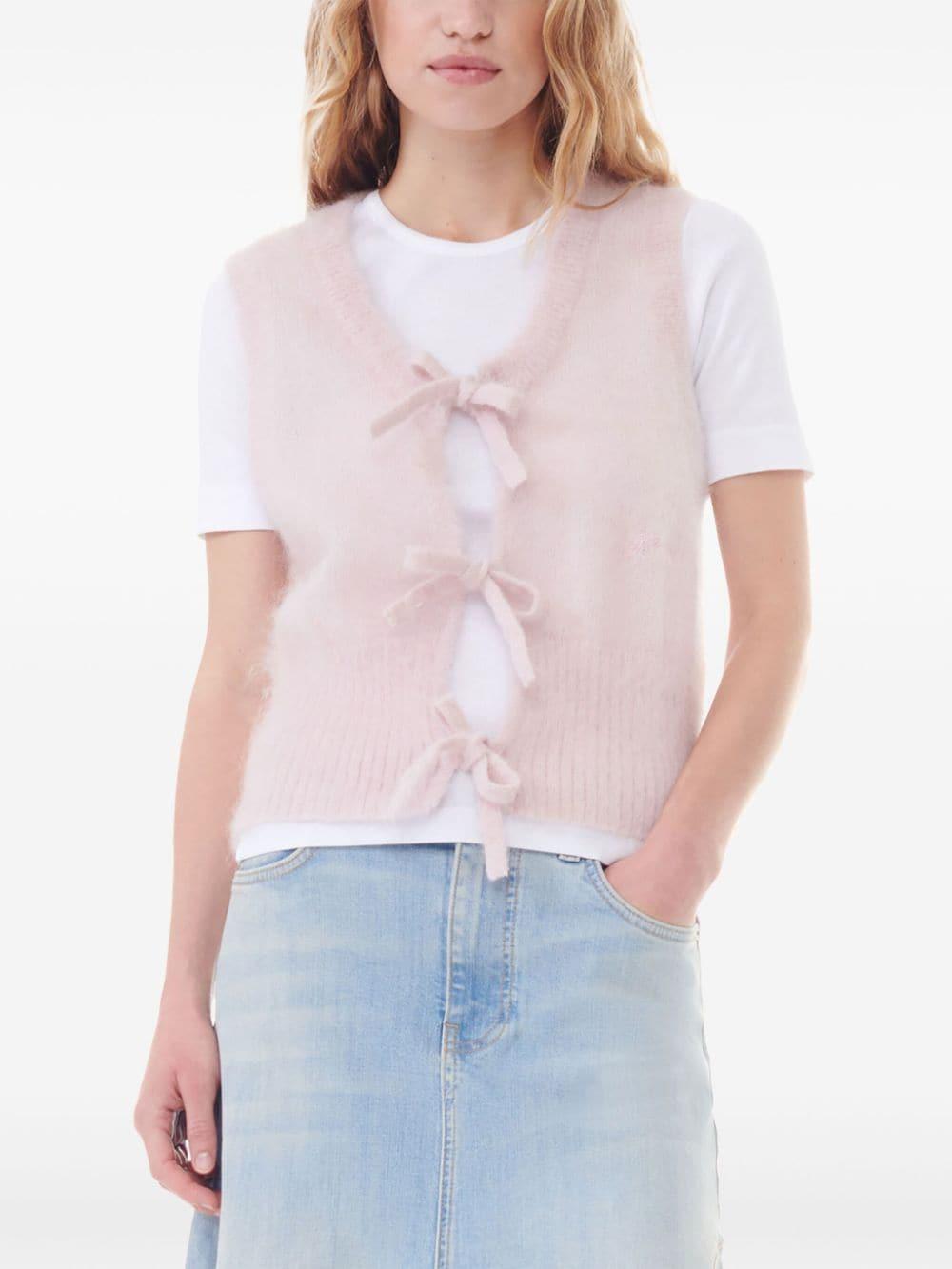 bow-fastening knitted vest. Evoking a romantic look, this GANNI vest is imagined in a light-pink hue and fastened with sweet bows, nodding to the coquette and balletcore trends. It's complete with logo embroidery and ribbed trims.