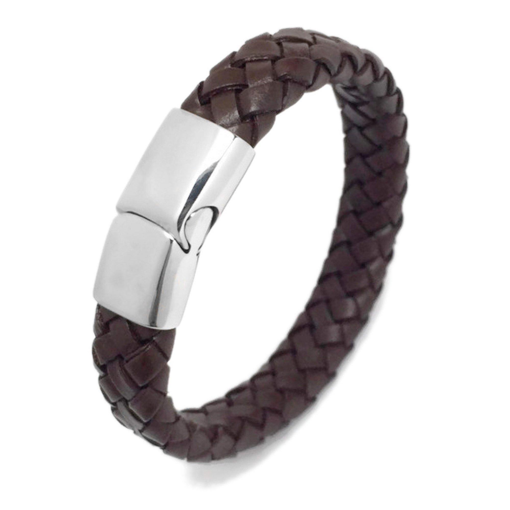 Wide Mens Dark Brown Leather Bracelet Cuff with Stainless Steel Magnetic Clasp (7.5 Inch)