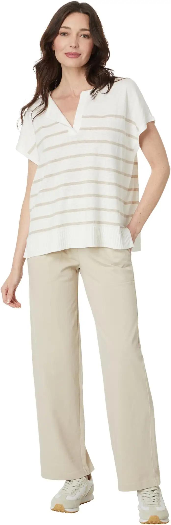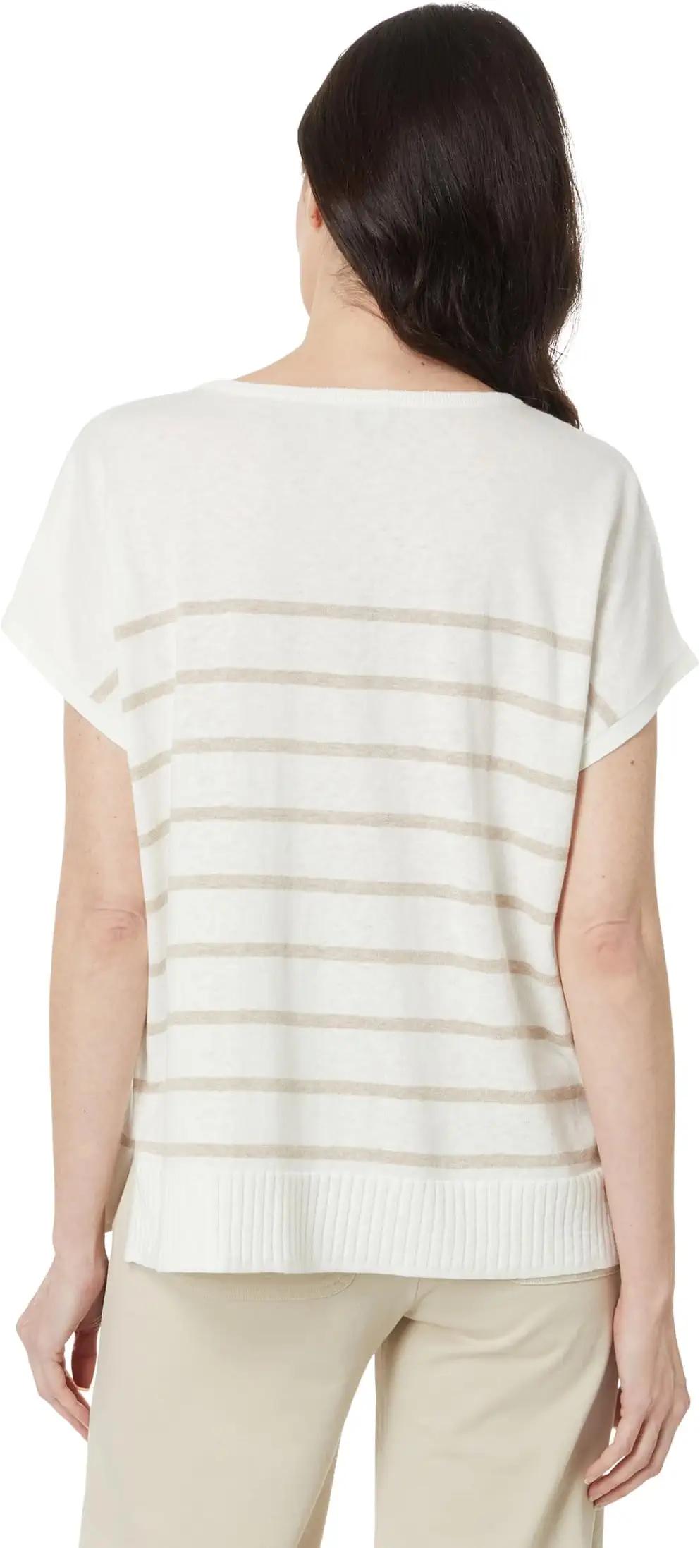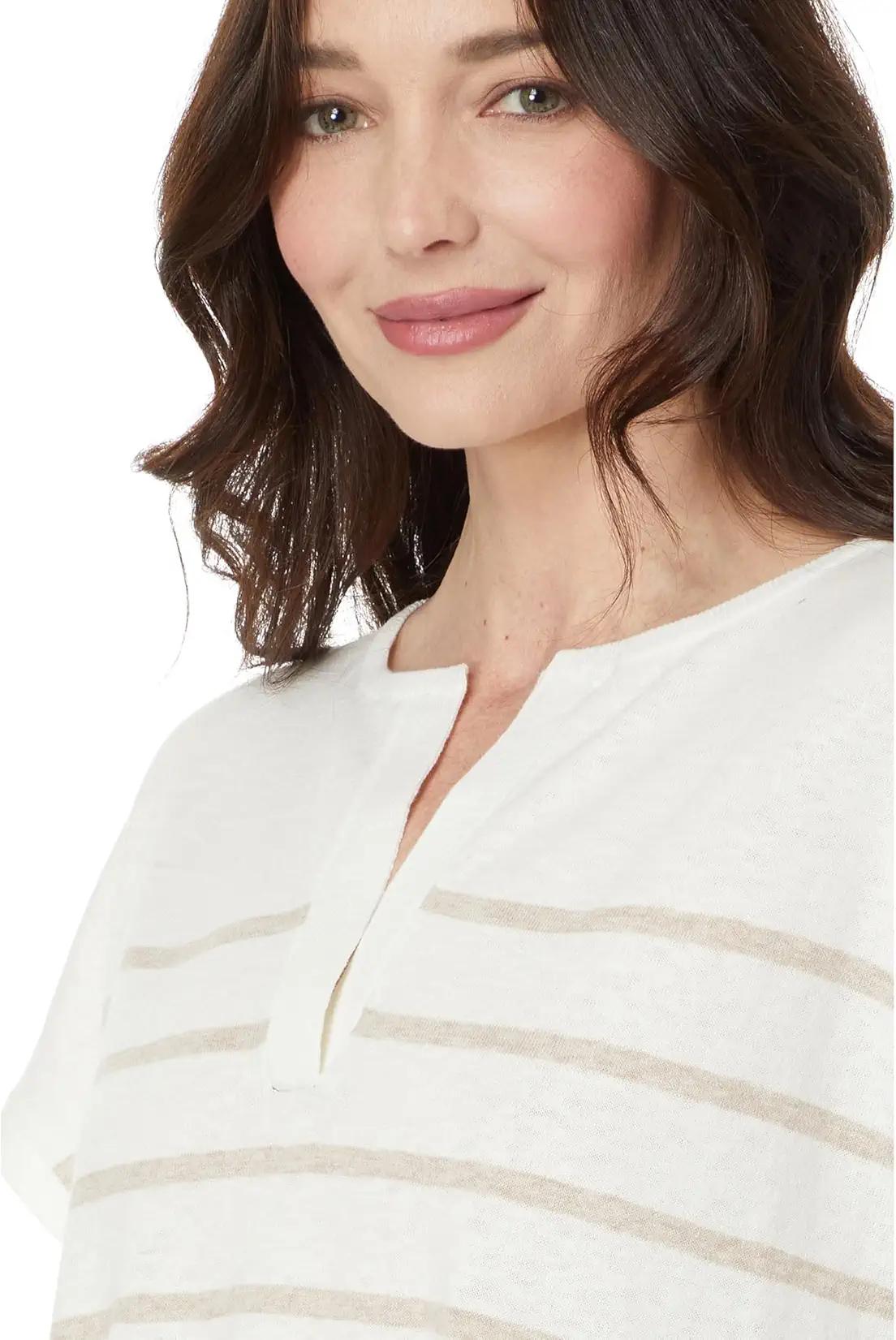Feel cozy and comfortable by wearing the Lilla P™ Stripe Split Neck Tunic Sweater. The pull-on style sweater has a crew neckline with a split design, short sleeves, and a straight hemline with side slits for a classy look. The regular-fit sweater features strope design that works well with your everyday jeans or crops.