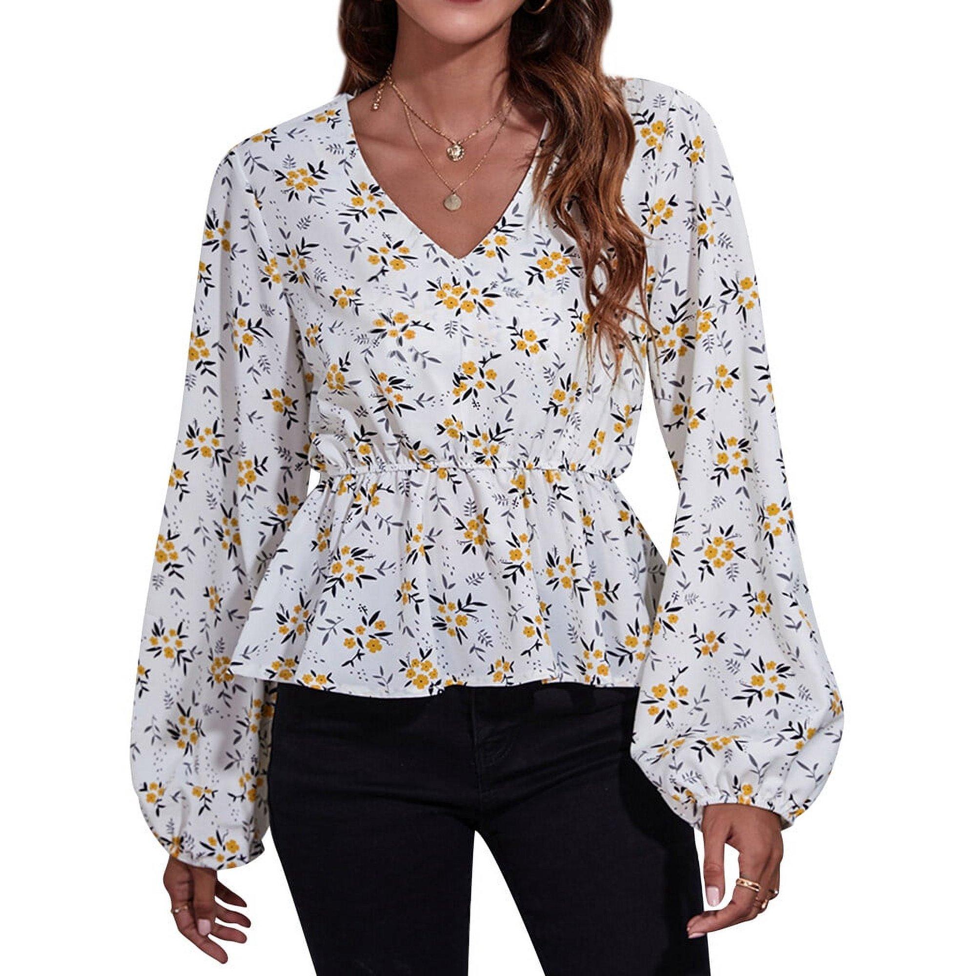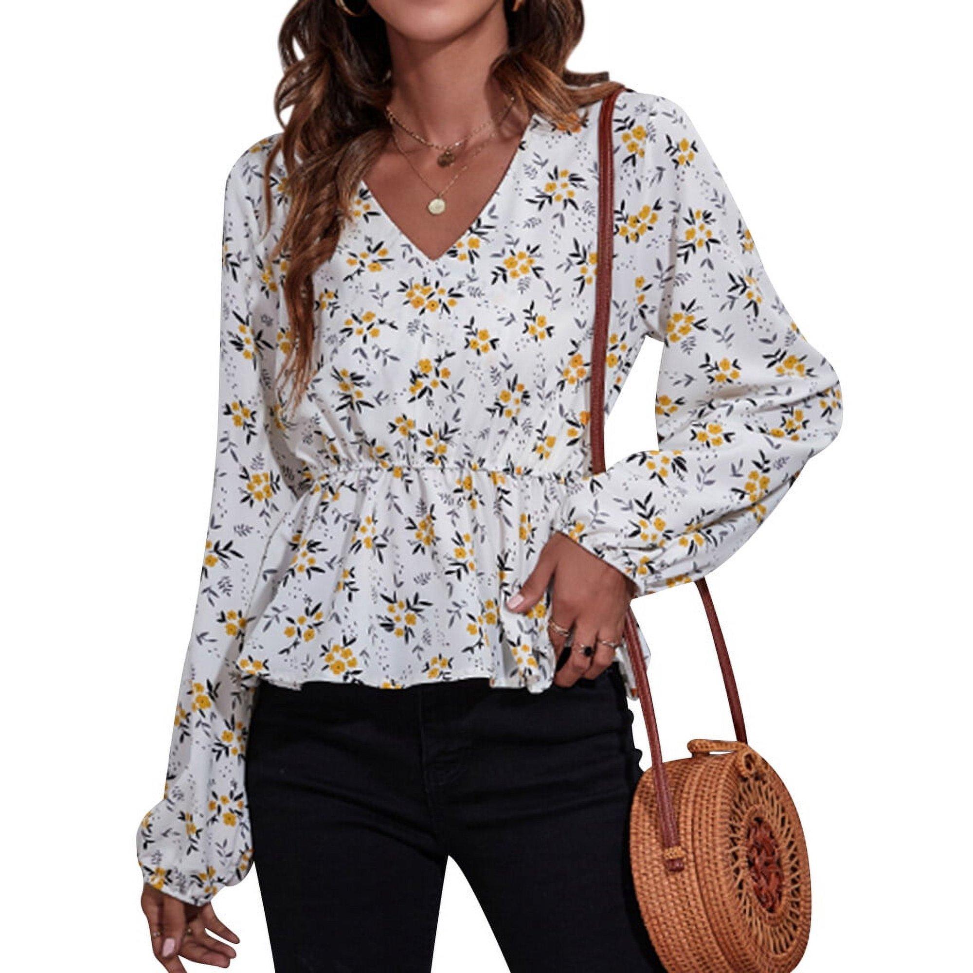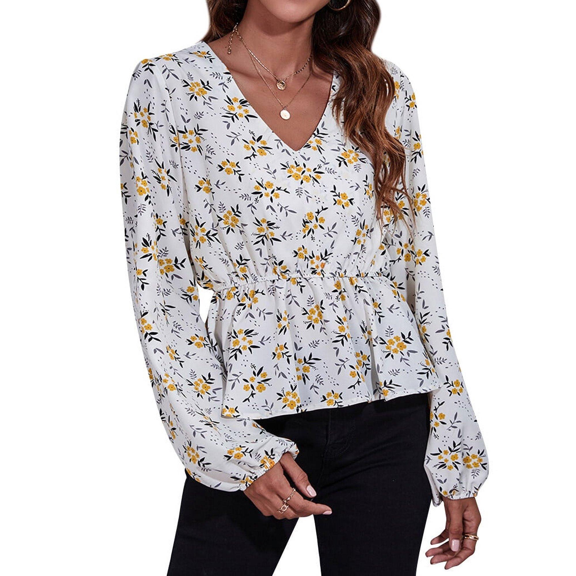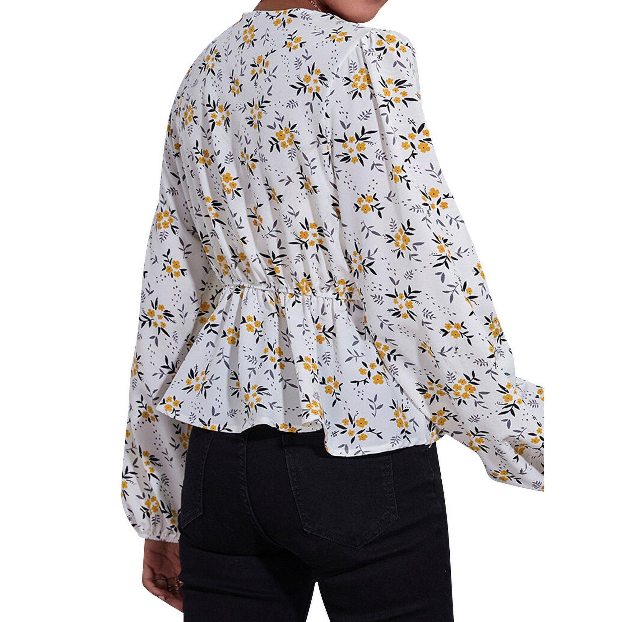 Xuanfei Women Floral Print V Neck Lantern Sleeve Elastic Waist Top
