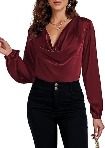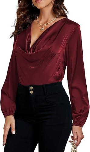 LYANER Women's Satin Silky Cowl Neck Drape Ruched Front Long Sleeve Blouse Shirt Top