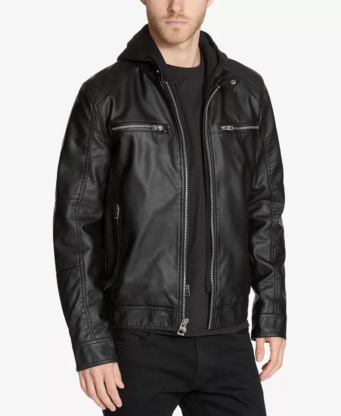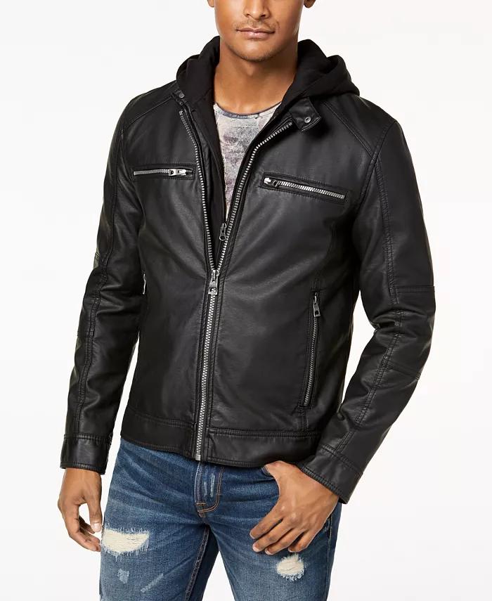 Men's Faux-Leather Detachable-Hood Motorcycle Jacket