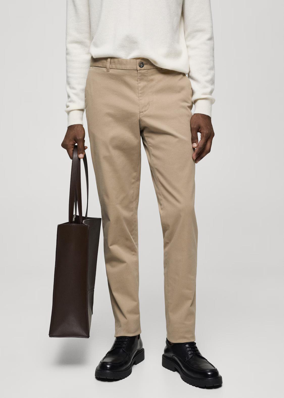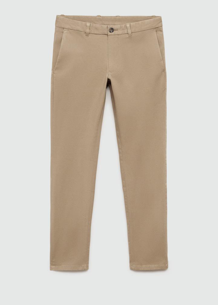 Slim fit. Chinos style. Five pockets. Cotton elastic. Belt loops. Zip and one button fastening. Two side pockets. Coin pocket. Two welt pockets on the back. The model is 6' 1.6" and is wearing a size 42.
